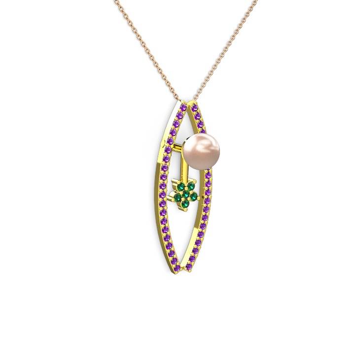 Pembe inci, ametist ve yeşil kuvars 8 ayar altın kolye (40 cm rose altın rolo zincir)