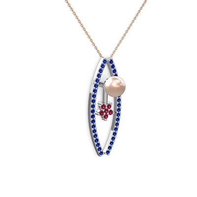 Pembe inci, lab safir ve rodolit garnet 8 ayar beyaz altın kolye (40 cm gümüş rolo zincir)