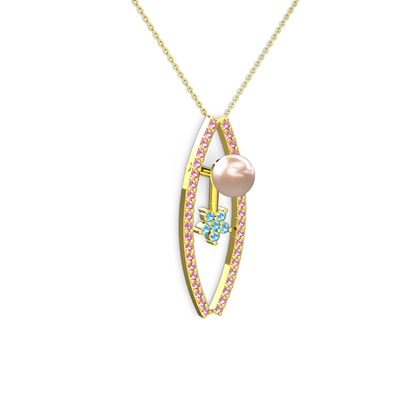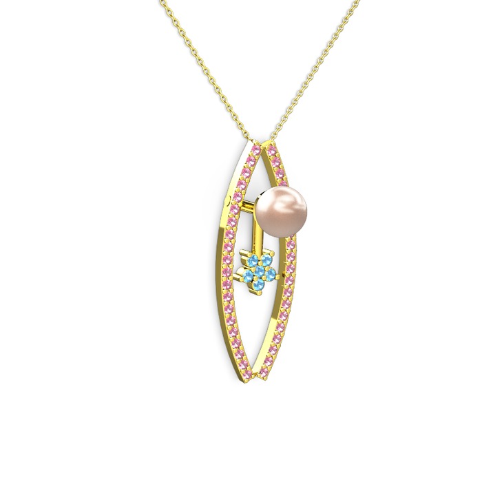 Pembe inci, pembe kuvars ve akuamarin 8 ayar altın kolye (40 cm altın rolo zincir)