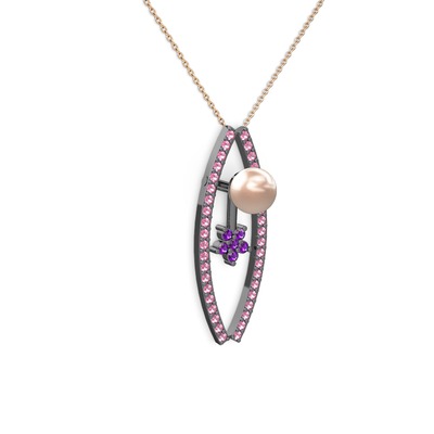 Pembe inci, pembe kuvars ve ametist 925 ayar siyah rodyum kaplama gümüş kolye (40 cm gümüş rolo zincir)
