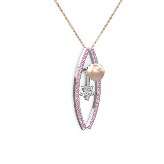 Pembe inci, pembe kuvars ve pırlanta 18 ayar beyaz altın kolye (0.066 karat, 40 cm rose altın rolo zincir)