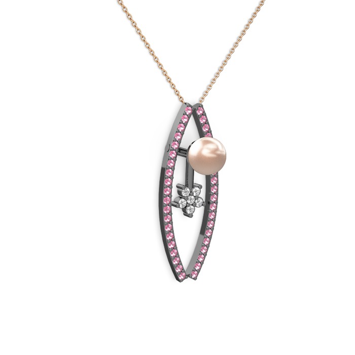 Pembe inci, pembe kuvars ve pırlanta 925 ayar siyah rodyum kaplama gümüş kolye (0.066 karat, 40 cm rose altın rolo zincir)