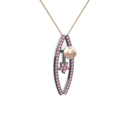 Pembe inci ve pembe kuvars 925 ayar siyah rodyum kaplama gümüş kolye (40 cm rose altın rolo zincir)