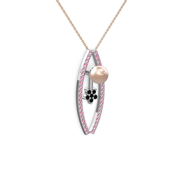 Pembe inci, pembe kuvars ve siyah zirkon 8 ayar beyaz altın kolye (40 cm rose altın rolo zincir)