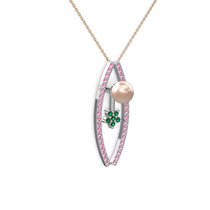Pembe inci, pembe kuvars ve yeşil kuvars 18 ayar beyaz altın kolye (40 cm rose altın rolo zincir)