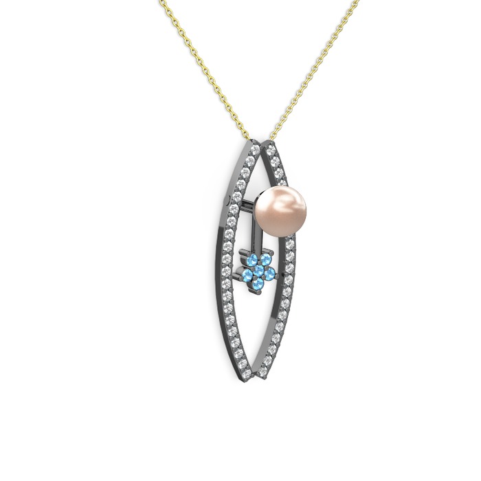 Pembe inci, pırlanta ve akuamarin 925 ayar siyah rodyum kaplama gümüş kolye (0.3 karat, 40 cm altın rolo zincir)