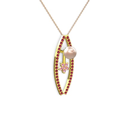 Pembe inci, rodolit garnet ve pembe kuvars 18 ayar altın kolye (40 cm rose altın rolo zincir)