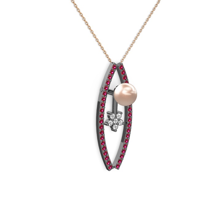Pembe inci, rodolit garnet ve pırlanta 925 ayar siyah rodyum kaplama gümüş kolye (0.066 karat, 40 cm rose altın rolo zincir)