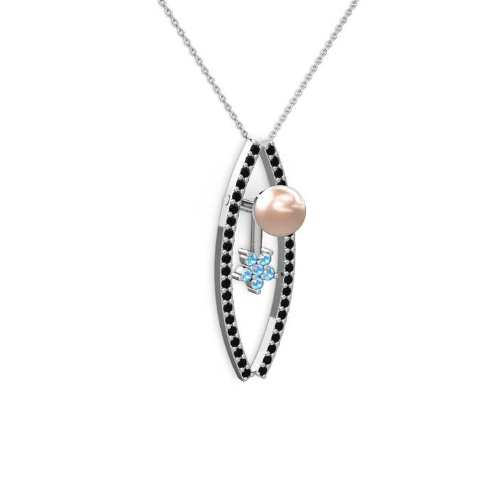 Pembe inci, siyah zirkon ve akuamarin 14 ayar beyaz altın kolye (40 cm beyaz altın rolo zincir)