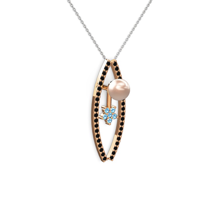 Pembe inci, siyah zirkon ve akuamarin 18 ayar rose altın kolye (40 cm beyaz altın rolo zincir)