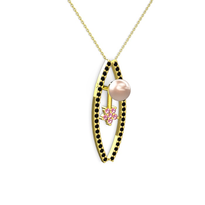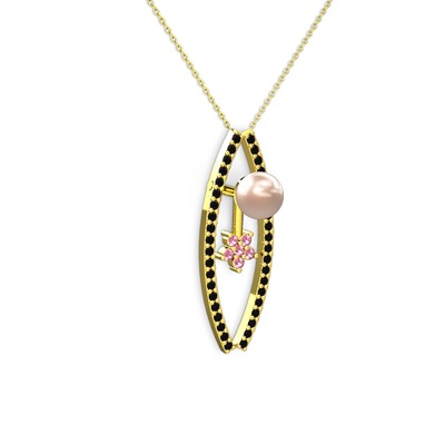 Pembe inci, siyah zirkon ve pembe kuvars 18 ayar altın kolye (40 cm altın rolo zincir)