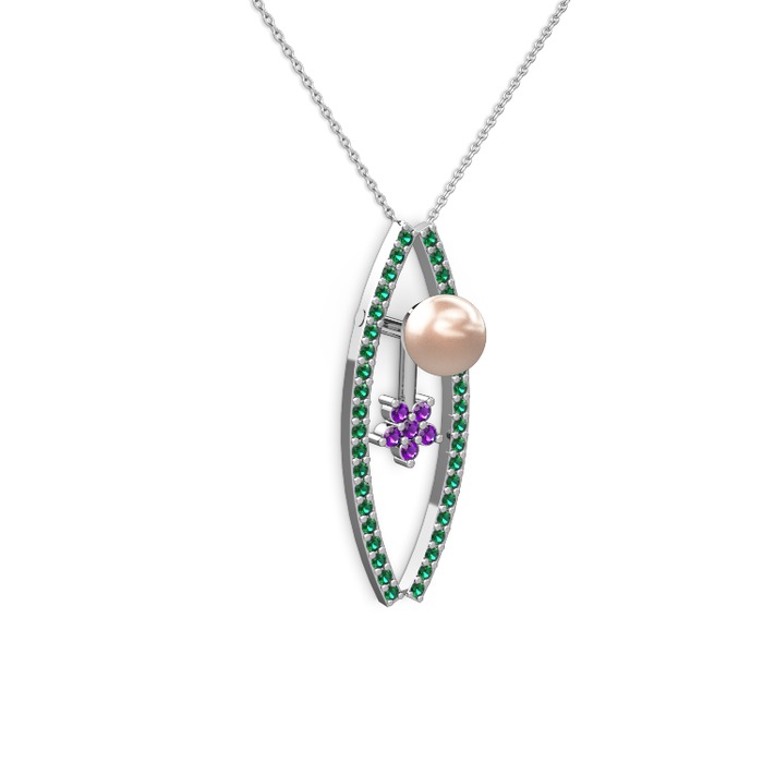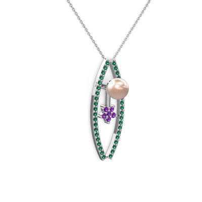 Pembe inci, yeşil kuvars ve ametist 925 ayar gümüş kolye (40 cm beyaz altın rolo zincir)
