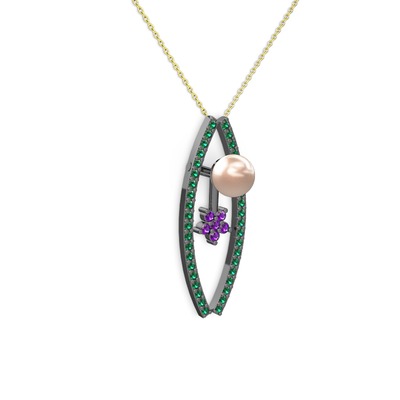 Pembe inci, yeşil kuvars ve ametist 925 ayar siyah rodyum kaplama gümüş kolye (40 cm altın rolo zincir)
