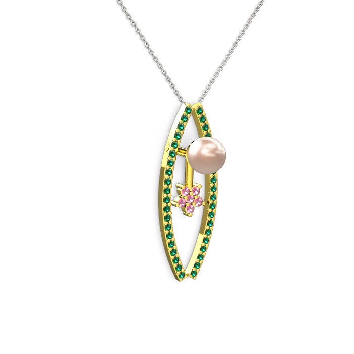 Pembe inci, yeşil kuvars ve pembe kuvars 14 ayar altın kolye (40 cm beyaz altın rolo zincir)