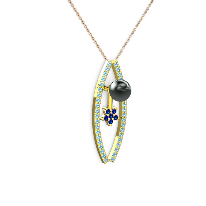 Siyah inci, akuamarin ve lab safir 8 ayar altın kolye (40 cm rose altın rolo zincir)