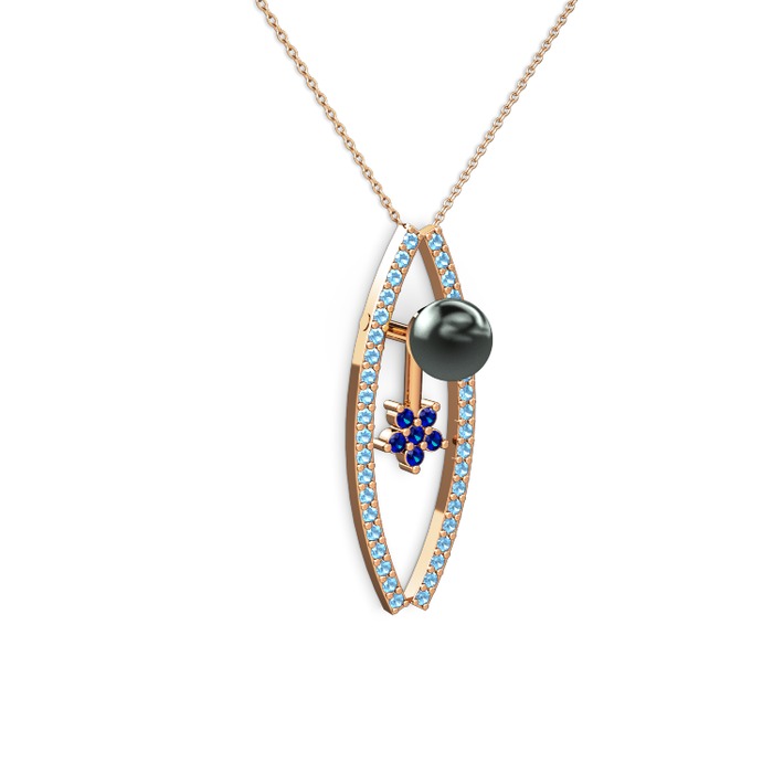 Siyah inci, akuamarin ve lab safir 925 ayar rose altın kaplama gümüş kolye (40 cm rose altın rolo zincir)