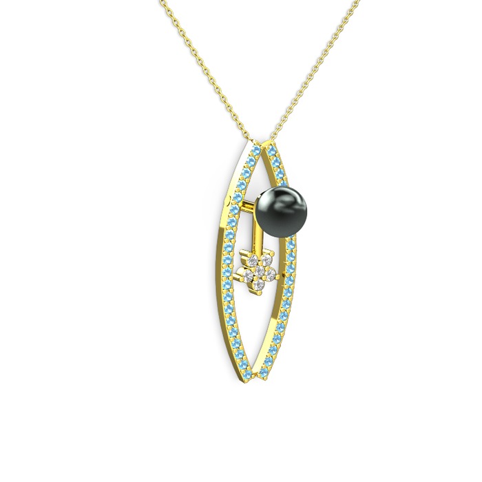 Siyah inci, akuamarin ve pırlanta 8 ayar altın kolye (0.066 karat, 40 cm altın rolo zincir)