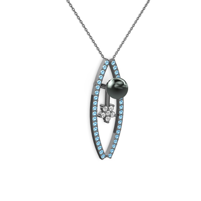 Siyah inci, akuamarin ve pırlanta 925 ayar siyah rodyum kaplama gümüş kolye (0.066 karat, 40 cm gümüş rolo zincir)