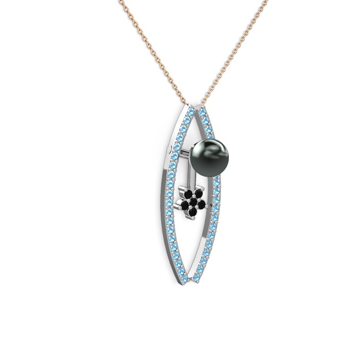 Siyah inci, akuamarin ve siyah zirkon 18 ayar beyaz altın kolye (40 cm rose altın rolo zincir)