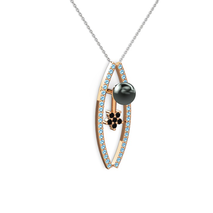 Siyah inci, akuamarin ve siyah zirkon 8 ayar rose altın kolye (40 cm beyaz altın rolo zincir)
