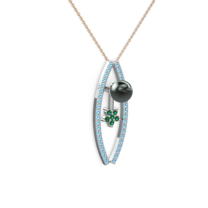 Siyah inci, akuamarin ve yeşil kuvars 18 ayar beyaz altın kolye (40 cm rose altın rolo zincir)