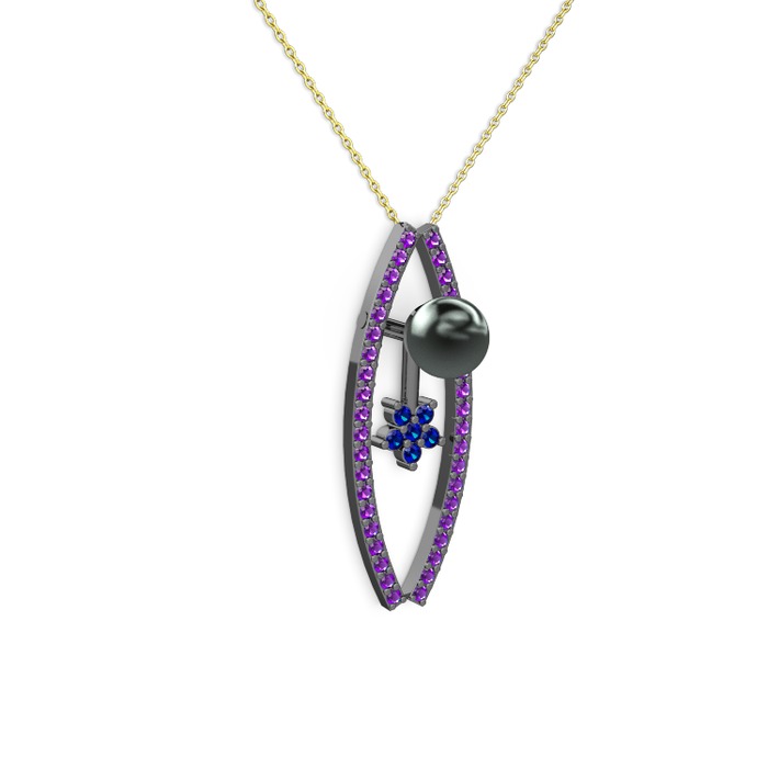 Siyah inci, ametist ve lab safir 925 ayar siyah rodyum kaplama gümüş kolye (40 cm altın rolo zincir)