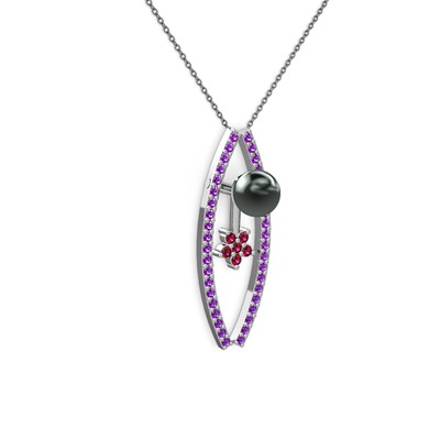 Siyah inci, ametist ve rodolit garnet 18 ayar beyaz altın kolye (40 cm gümüş rolo zincir)