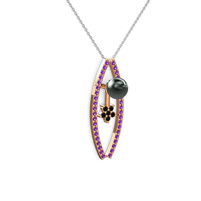 Siyah inci, ametist ve siyah zirkon 14 ayar rose altın kolye (40 cm beyaz altın rolo zincir)
