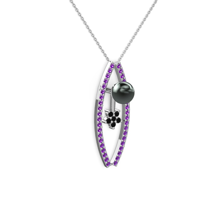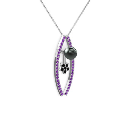 Siyah inci, ametist ve siyah zirkon 925 ayar gümüş kolye (40 cm beyaz altın rolo zincir)