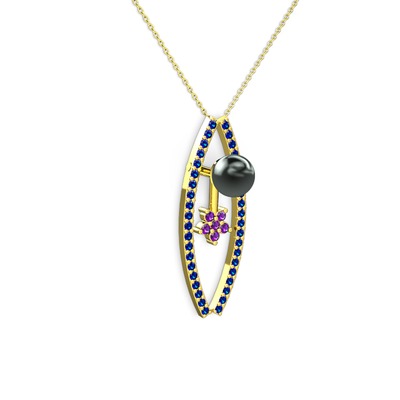 Siyah inci, lab safir ve ametist 18 ayar altın kolye (40 cm altın rolo zincir)