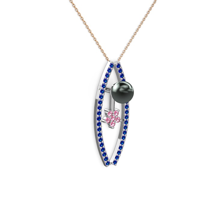 Siyah inci, lab safir ve pembe kuvars 925 ayar gümüş kolye (40 cm gümüş rolo zincir)