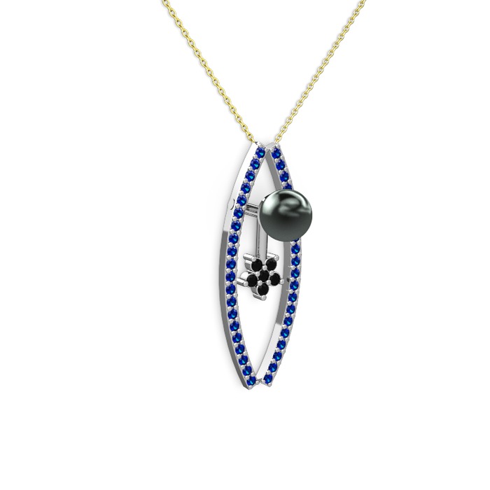 Siyah inci, lab safir ve siyah zirkon 14 ayar beyaz altın kolye (40 cm altın rolo zincir)