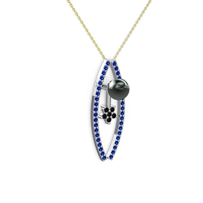 Siyah inci, lab safir ve siyah zirkon 8 ayar beyaz altın kolye (40 cm gümüş rolo zincir)