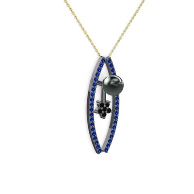 Siyah inci, lab safir ve siyah zirkon 925 ayar siyah rodyum kaplama gümüş kolye (40 cm altın rolo zincir)