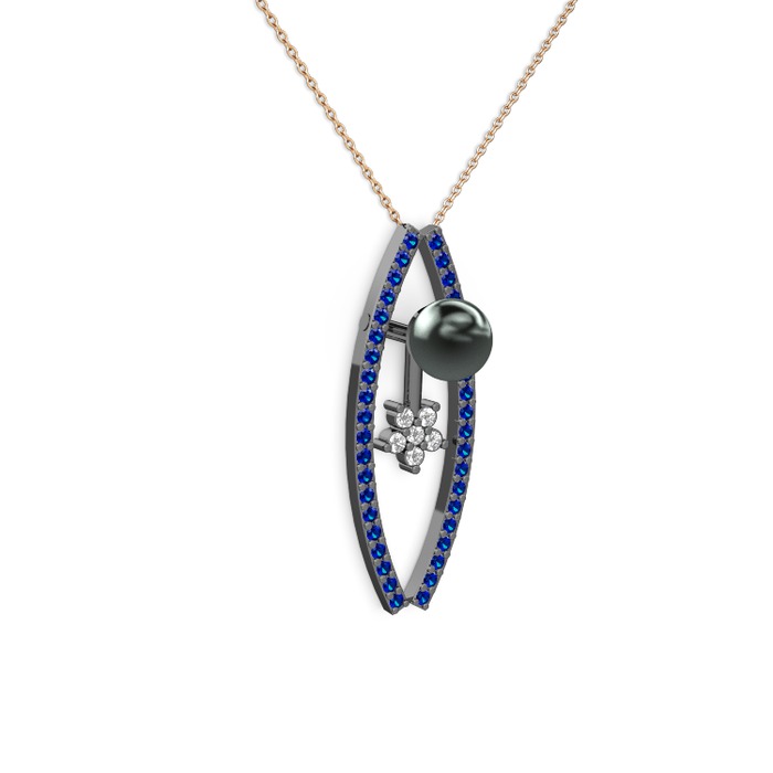 Siyah inci, lab safir ve swarovski 925 ayar siyah rodyum kaplama gümüş kolye (40 cm rose altın rolo zincir)
