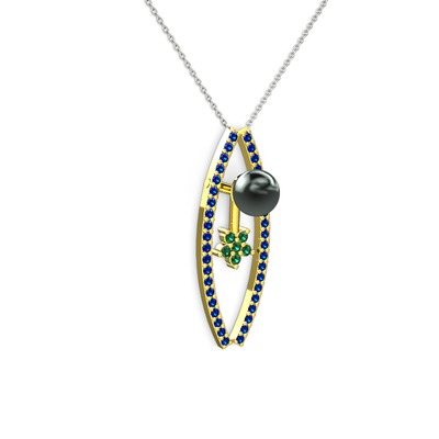 Siyah inci, lab safir ve yeşil kuvars 18 ayar altın kolye (40 cm beyaz altın rolo zincir)