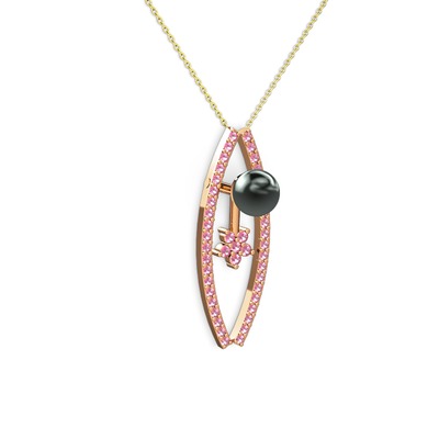 Siyah inci ve pembe kuvars 14 ayar rose altın kolye (40 cm altın rolo zincir)