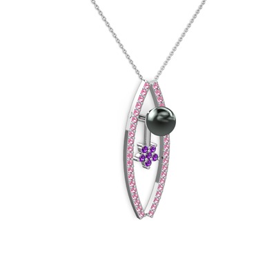 Siyah inci, pembe kuvars ve ametist 14 ayar beyaz altın kolye (40 cm beyaz altın rolo zincir)
