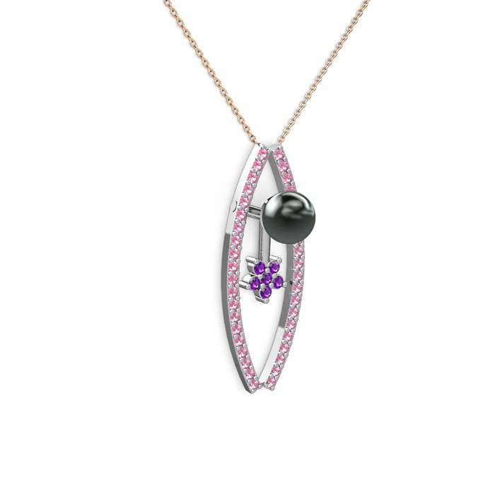 Siyah inci, pembe kuvars ve ametist 8 ayar beyaz altın kolye (40 cm rose altın rolo zincir)