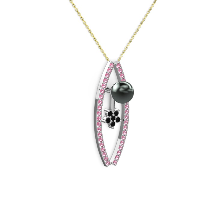 Siyah inci, pembe kuvars ve siyah zirkon 18 ayar beyaz altın kolye (40 cm altın rolo zincir)