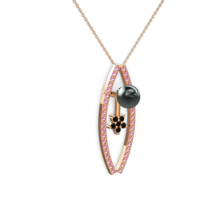 Siyah inci, pembe kuvars ve siyah zirkon 18 ayar rose altın kolye (40 cm rose altın rolo zincir)