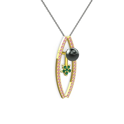 Siyah inci, pembe kuvars ve yeşil kuvars 925 ayar altın kaplama gümüş kolye (40 cm gümüş rolo zincir)