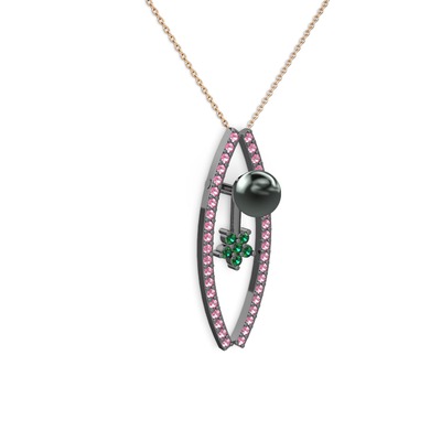 Siyah inci, pembe kuvars ve yeşil kuvars 925 ayar siyah rodyum kaplama gümüş kolye (40 cm rose altın rolo zincir)