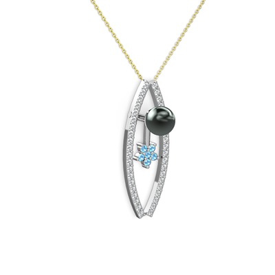 Siyah inci, pırlanta ve akuamarin 8 ayar beyaz altın kolye (0.3 karat, 40 cm gümüş rolo zincir)
