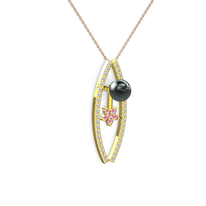 Siyah inci, pırlanta ve pembe kuvars 14 ayar altın kolye (0.3 karat, 40 cm rose altın rolo zincir)