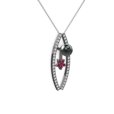 Siyah inci, pırlanta ve rodolit garnet 925 ayar siyah rodyum kaplama gümüş kolye (0.3 karat, 40 cm beyaz altın rolo zincir)