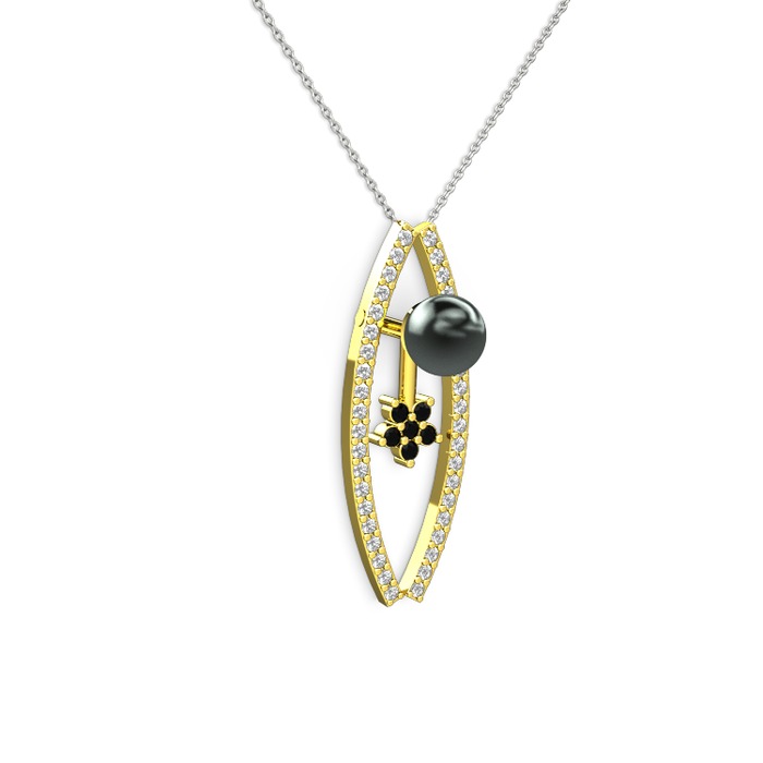 Siyah inci, pırlanta ve siyah zirkon 18 ayar altın kolye (0.3 karat, 40 cm beyaz altın rolo zincir)