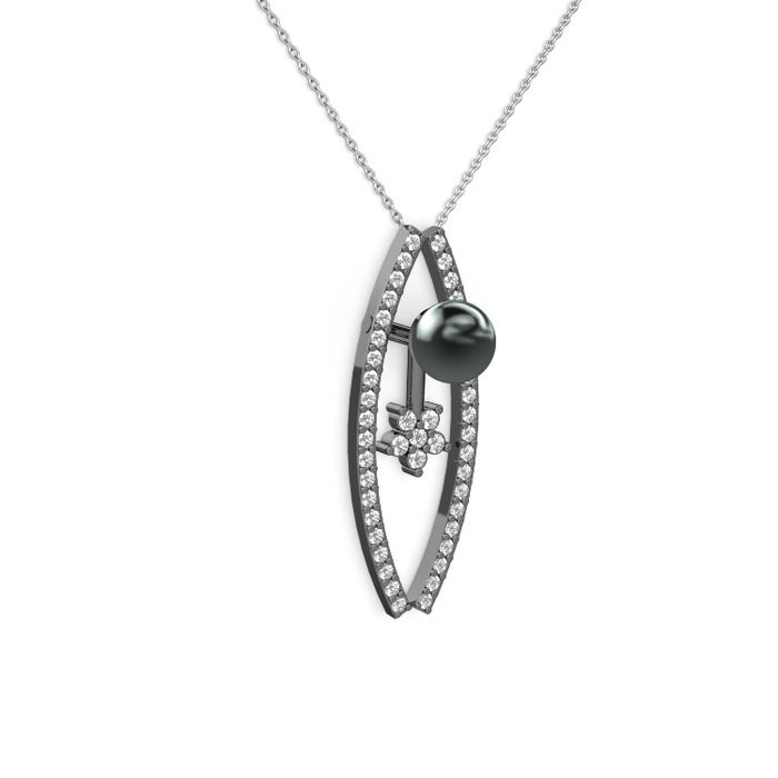 Siyah inci, pırlanta ve swarovski 925 ayar siyah rodyum kaplama gümüş kolye (0.3 karat, 40 cm beyaz altın rolo zincir)