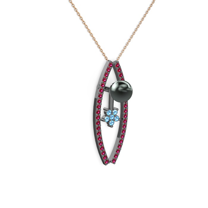 Siyah inci, rodolit garnet ve akuamarin 925 ayar siyah rodyum kaplama gümüş kolye (40 cm rose altın rolo zincir)
