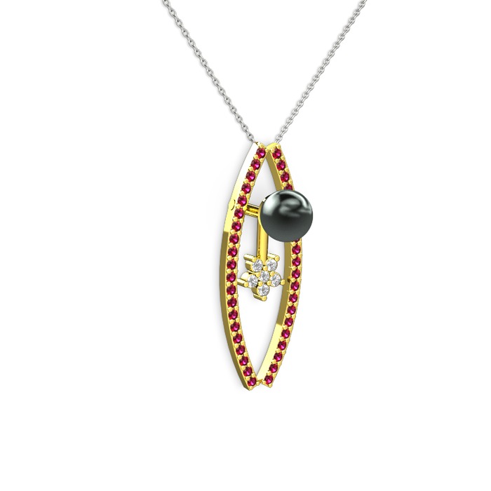 Siyah inci, rodolit garnet ve pırlanta 14 ayar altın kolye (0.066 karat, 40 cm gümüş rolo zincir)